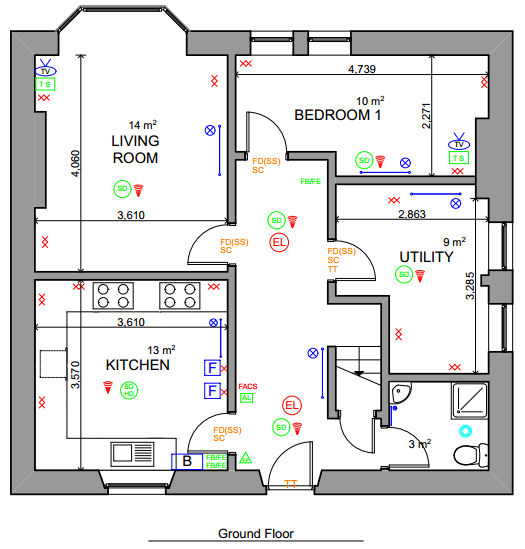 The kitchen includes electric ovens and hobs, microwave oven, full-height fridge/freezers, and dish washer.